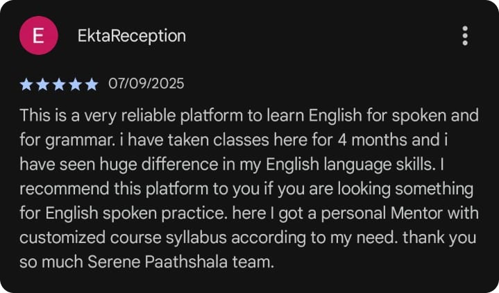 Suman Mam started her impactful journey 15 years ago in Mumbai, aiming to empower individuals with language skills. What distinguishes Serene Pathshala’s Spoken English Course is Suman Mam’s unique emphasis on continuous conversation. Moving beyond role learning, she creates an environment where students engage in meaningful spoken interactions with experienced mentors, fostering growth in a supportive atmosphere.